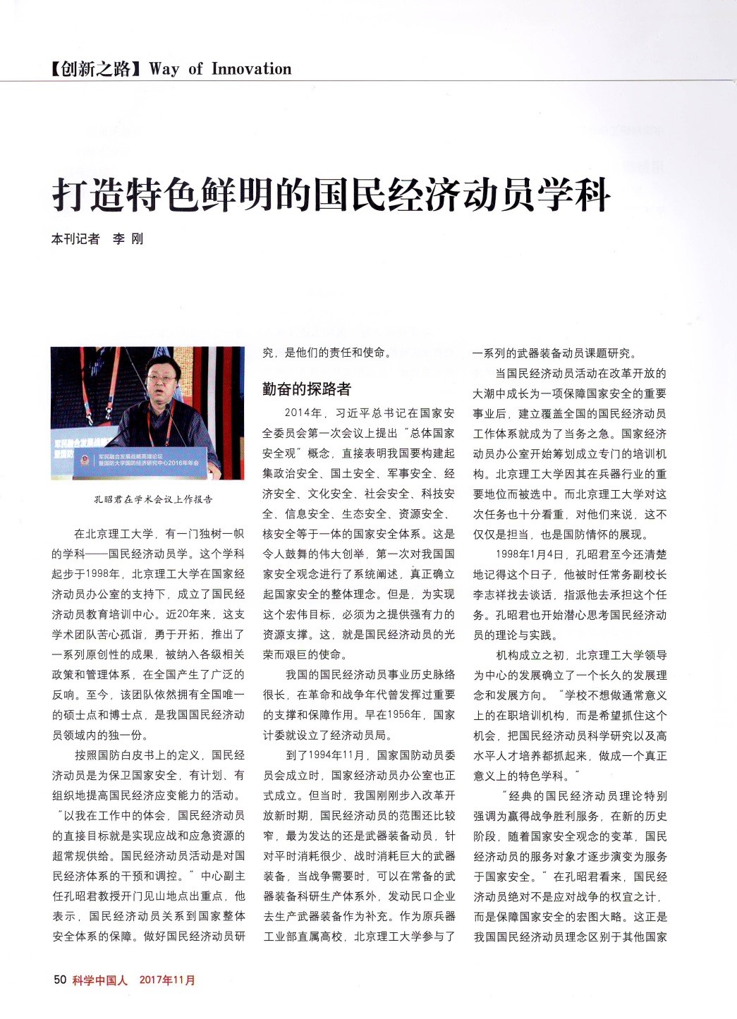 【编者按】刚刚出版的《科学中国人》2017年第11期(上),载文介绍了我校国民经济动员学科。这是该刊记者李刚采访我校管理与经济学院副院长、国民经济动员教育培训中心常务副主任孔昭君教授以后撰写的专稿,发表在该刊《创新之路》专栏。